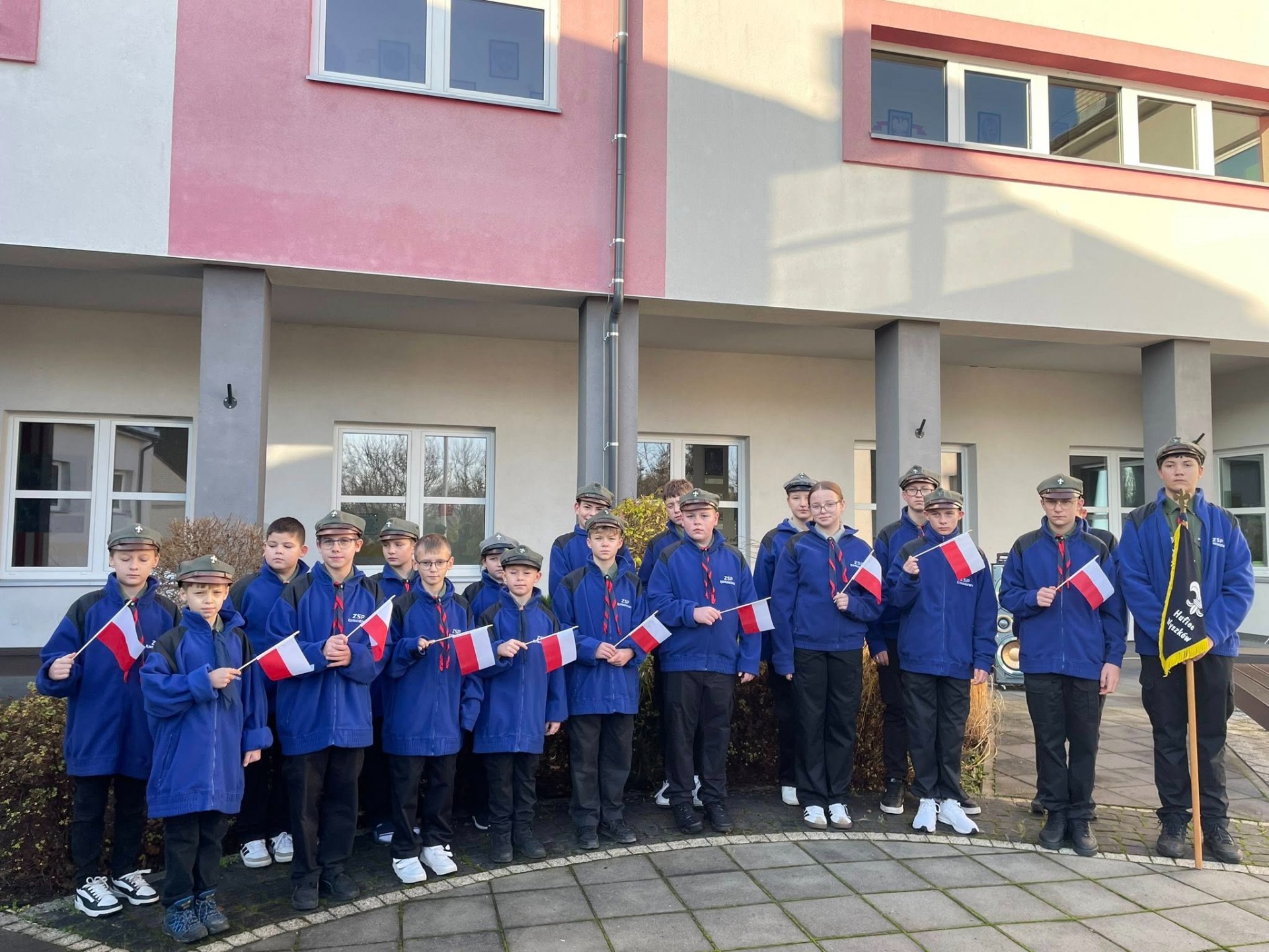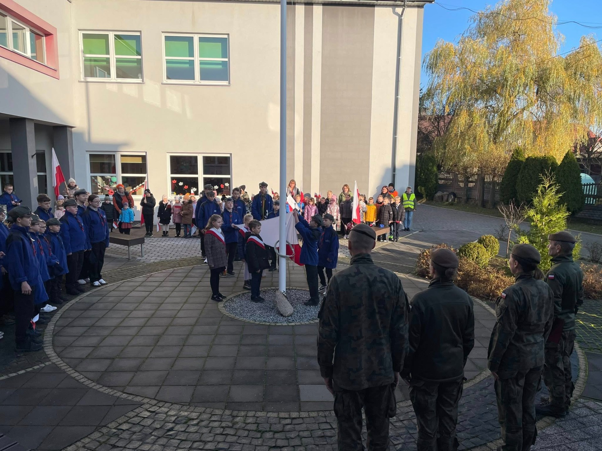Następnie, na dziedzińcu przed szkołą, odbyła się ceremonia wciągnięcia flagi państwowej na maszt oraz wspólne odśpiewanie hymnu narodowego „Mazurka Dąbrowskiego”.