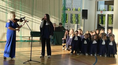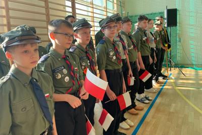 Po części oficjalnej wszyscy udali się na salę gimnastyczną, gdzie miał miejsce montaż słowno-muzyczny przygotowany przez uczniów pod kierunkiem pani Uliany Kikoły oraz pana dyrektora Jacka Stachacza.